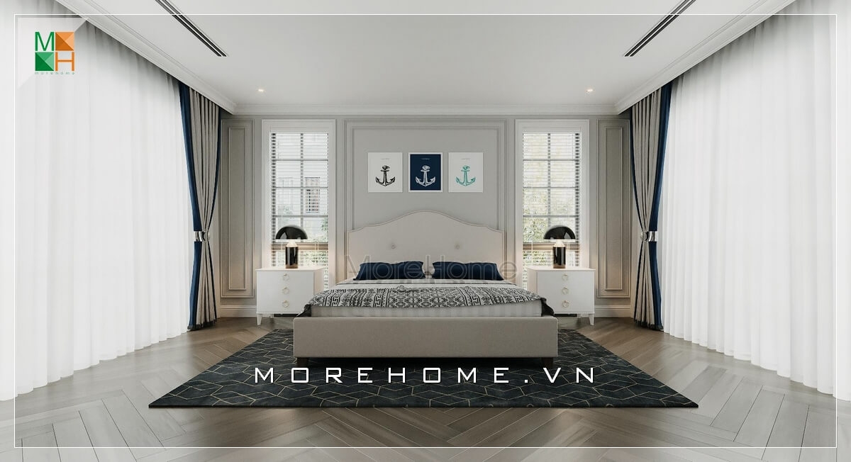 Thiết kế phòng ngủ biệt thự, nhà phố với sắc trắng chủ đạo cùng giường ngủ bọc da đầu giường đầy sang trọng.
