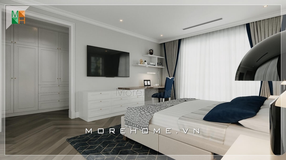 Thiết kế phòng ngủ thông với không gian để đồ, quần áo tiện lợi và tạo sự liền mạch rộng rãi phù hợp cho cả biệt thự, chung cư cao cấp hay nhà phố