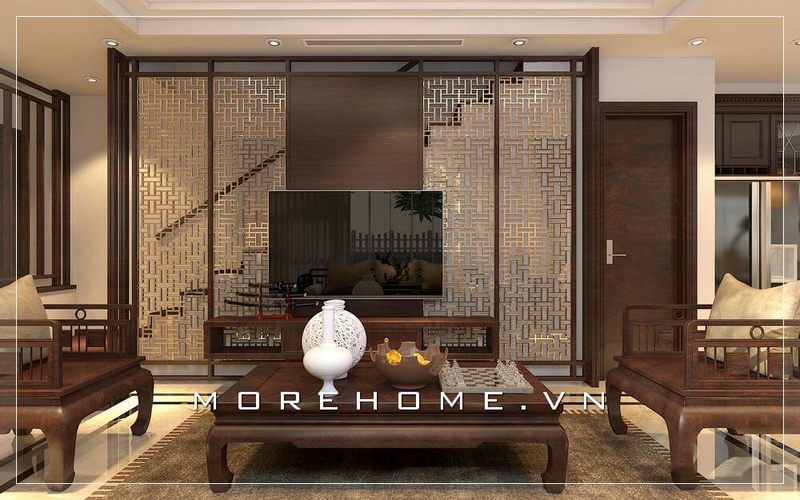 Mẫu thiết kế phòng khách biệt thự theo phong cách Indochine với nội thất gỗ tự nhiên sơn đen kết hợp nỉ sọc cao cấp