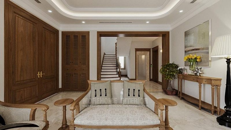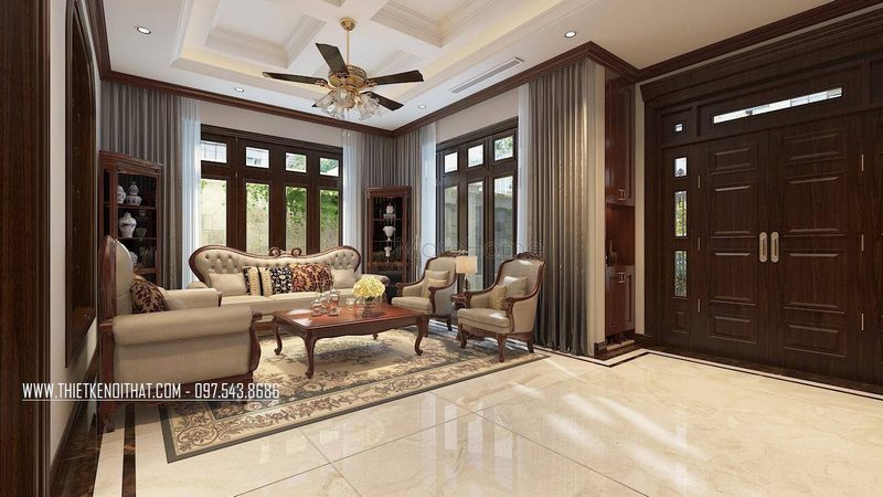 Thiết kế phòng khách phong cách tân cổ điển với nội thất gỗ óc chó tự nhiên bọc nỉ Bỉ cao cấp
