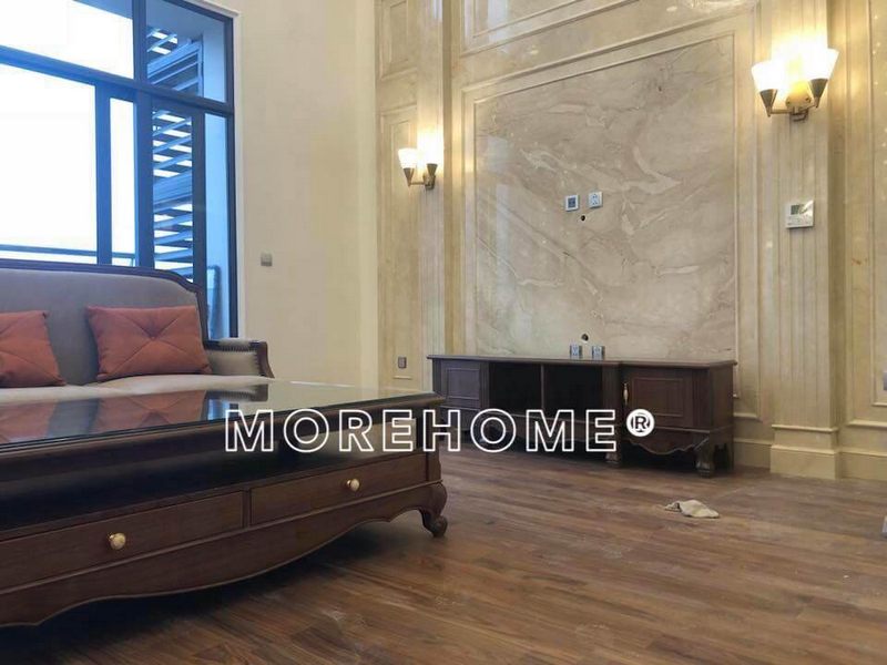 Phòng khách căn hộ chung cư thông tầng đầy sang trọng đẳng cấp với tâm điểm là bộ sofa gỗ óc chó uốn lượn nghệ thuật theo phong cách tân cổ điển êm ái với vỏ bọc nhung mềm mại.