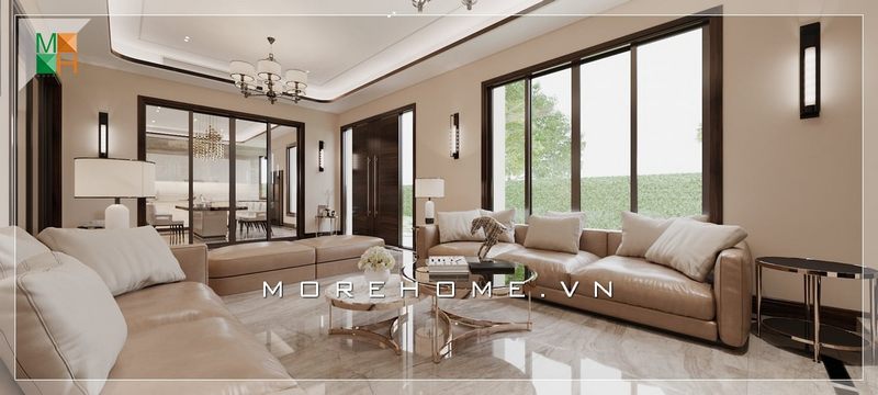 Không gian phòng khách biệt thự, nhà phố được trang bị các cửa kính từ cửa sổ đến cửa chính, mang lại sự thông thoáng và giúp gia chủ và khách đến chơi nhà cảm nhận được sự thư giãn.