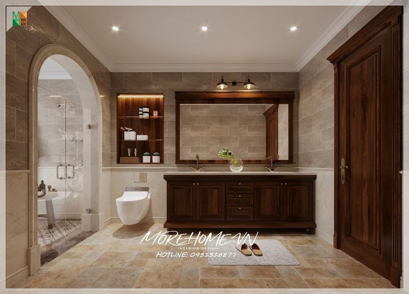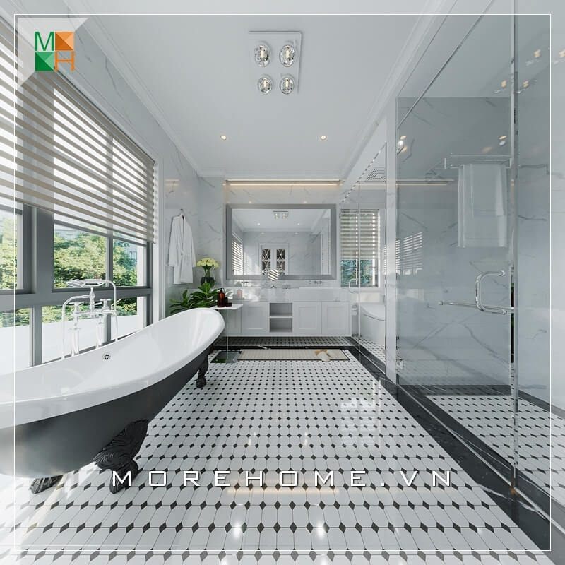 Phòng tắm của nhà phố, biệt thự cao cấp được thiết kế rộng rãi với vách kính trong suốt và đá ốp sang trọng.