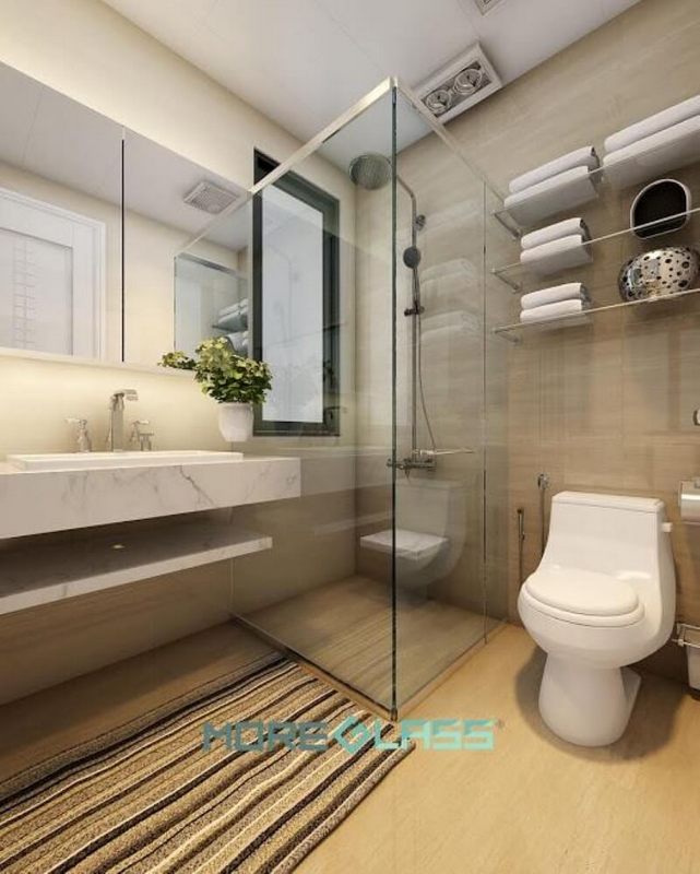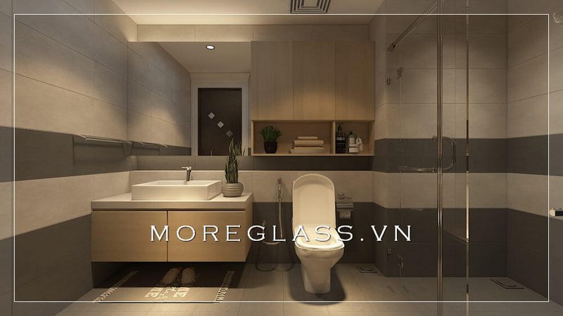Phòng tắm được thiết kế hiện đại bằng cách kết hợp nhà vệ sinh và vách tắm kính 90 độ MG-011 để hạn chế văng nước ra sàn, giúp giữ cho phòng tắm luôn sạch sẽ.