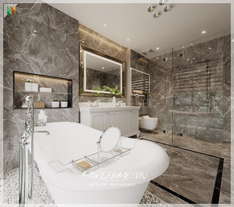 Phòng tắm master được trang bị bồn tắm, tường và sàn được làm bằng đá ốp nhân tạo màu xám vân mây cao cấp, giúp tăng thêm độ thẩm mỹ cũng như đảm bảo sức khỏe cho người sử dụng.