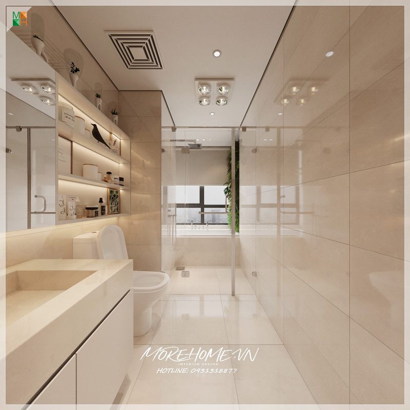 Việc lắp đặt hoàn chỉnh đá ốp lavabo cho phòng tắm nhà vệ sinh của căn hộ Penthouse Skylake Phạm Hùng đã được thi công.